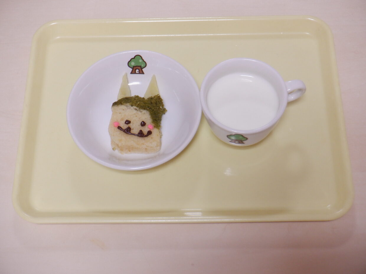 ※今日は節分メニューでした。鬼さんのおにぎり・金棒バーグ・鬼の蒸しパンなど、節分に合わせた献立になっています。なお、誤飲防止のために、節分豆ではなく煮豆にかえて対応しています。ご家庭でも、今日の給食やおやつの話を聞いてみてくださいね。